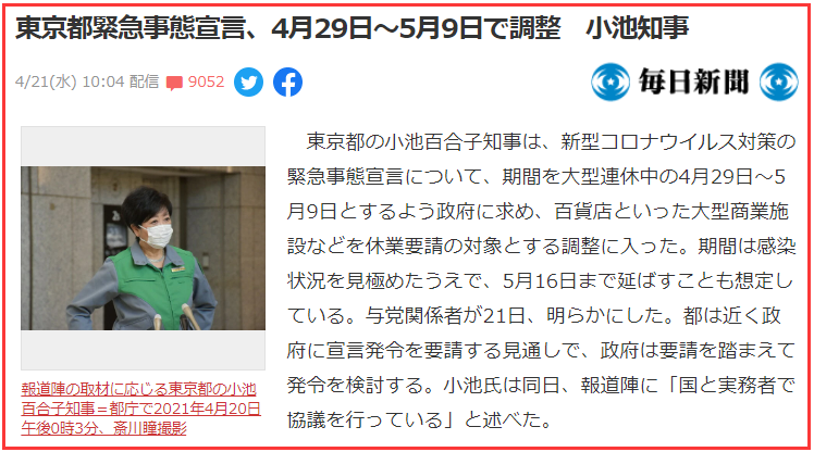 Apr 21, 2021 · 新型コロナウイルスの感染再拡大を受け、京都府が改正特別措置法に基づく緊急事態宣言の発令を政府に要請する方向で調整していることが21日.